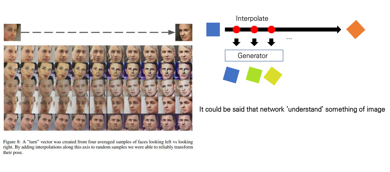 또한 이러한 특징은 GAN에서 학습한 분포에서 이미지 사이에 이루는 축에서 interpolate을 시킨 샘플들을 Generate해보았을 때도 유사한 결과들을 도출할 수 있습니다.