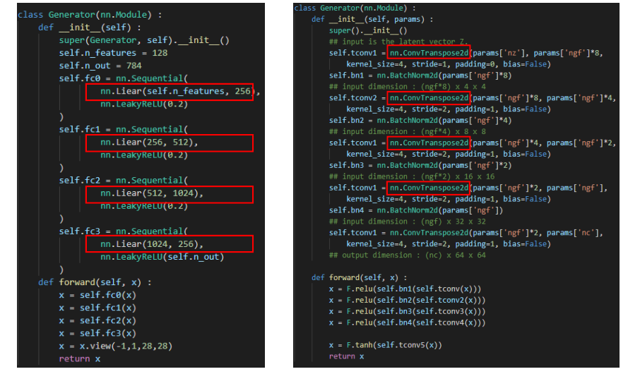 왼쪽의 경우 일반적인 Vanilla GAN의 Generator고 오른쪽의 경우는 DCGAN의 Generator입니다. 빨간 색 박스를 보시면 일반적인 FC Layer가 전부 Convolution Layer로 바뀐 것을 볼 수 있습니다. 그리고 위에서는 ConvTranspose2d로 Transpose Convolution을 적용한 것을 확인할 수 있습니다.