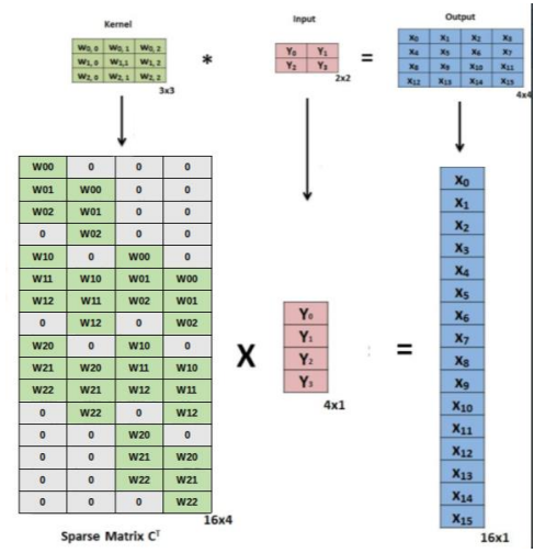 즉 3x3 kernel을 밑의 Sparse Matrix C로 나타낼 수 있으며 input을 1-dimension vector로 나타내어 둘의 행렬 연산을 취해주면 위의 strided convolution 연산이 가능하며 이 때 1-dimension의 output vector가 나오게 됩니다. 그리고 이 폼을 바탕으로 upsampling을 수행합니다. 아래 그림을 보시죠