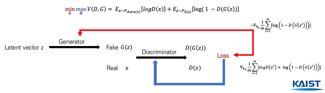 맨 위의 수식은 GAN의 전체 objective function입니다. 보시다시피 Generator에서 objective function을 optimize하는 방향과 Discriminator에서 optimize하는 방향은 각각 상이한 것을 확인할 수 있습니다. Generator는 objective function을 minimize하려고 하기 때문에 gradient를 -방향으로 가중치를 업데이트 시켜주지만, 반면 Discriminator는 objective function을 maximize하려고 하기 때문에 gradient를 +방향으로 업데이트를 시켜주려 하기 때문에 학습이 간혹 불안정하게 진행이 되는 경우가 있습니다. 따라서 때때로 유사하지 않는 non-sensical한 output을 내놓는 경우가 존재합니다.