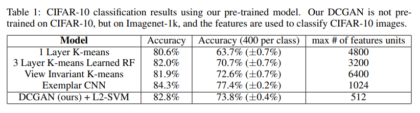 다음으로 저자는 앞서 언급드렸듯 GAN의 네트워크, 구체적으로 Discriminator가 이미지의 특징을 얼마나 잘 잡고 있는 지를 확인하기 위해, 우선 image classification task를 잘 수행하는 지를 점검하고자 하였습니다. 구체적인 설계로는 discriminator를 featur extractor로 사용해서 이들이 내놓는 결과를 supervised classifier에 집어 넣어 ( 구체적으로는 linear classifier ) 그 분류 결과가 정확한 지를 측정함으로서 feature extractor로서의 성능을 확인합니다. 구체적으로 저자는 Imagenet-1k 데이터를 통해 pre-trained 된 모형을 가지고 CIFAR-10 데이터를 이용하여 실험을 수행하였고, discriminator로부터 4x4 grid feature를 뽑아낸 다음, 28,672 크기의 벡터로 전환하여 L2-SVM 모형을 훈련시켰다고 합니다. 다른 classifier 모형들과 성능을 비교하였고 성능은 아래 표와 같이 exemplar CNN 모형 다음으로 준수한 성능을 보인 것을 알 수 있습니다.
