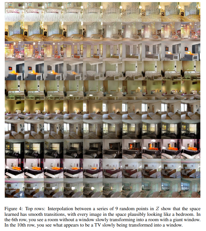 9개의 random point에 대해 보간을 수행했을 때의 변화 예시입니다. 점차적으로 smooth한 변화를 보임을 알 수 있습니다. 6번째 줄의 경우 점차 벽이 창문으로 변화하는 모습을 볼 수 있고 10번째 줄에서는 TV가 창문으로 변화하는 것을 볼 수 있습니다. 이로서 저자는 네트워크가 단순히 데이터를 memorize하지 않았음을 설명합니다.