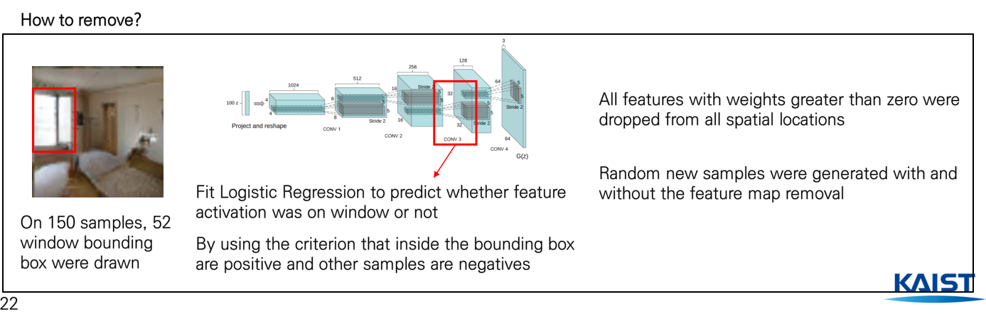 첫 번째로 왼쪽의 그림처럼 제거할 창문에 bounding box를 그립니다. 다음으로 Generator의 두번째 끝단의 네트워크에서 Logistic Regression을 fitting 시켜서 여기서 bounding box 내부는 양수고 바깥은 음수가 나오는 경우, 즉 다른 말로 해당 부분에 대해서 가중치가 양수 값을 갖는 모든 경우는 drop을 시킴으로써 제거를 하게 됩니다. 그렇게 제거된 filter를 사용하여 Generate을 수행했을 때 정말 창문이 없는 사진이 나오는지를 실험해보았습니다.
