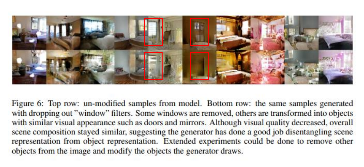 이 논문의 경우, Generator에서 학습된 일부 가중치를 drop out 시켰을 때, 즉 특정 object를 학습되었다고 판단된 특정 filter를 제거하면 정말 그 object가 제거된 이미지가 나오는 지를 실험하는 과정을 거쳤습니다. 본 연구에서는 window를 학습한 filter를 제거함으로써 실험을 진행하였습니다.