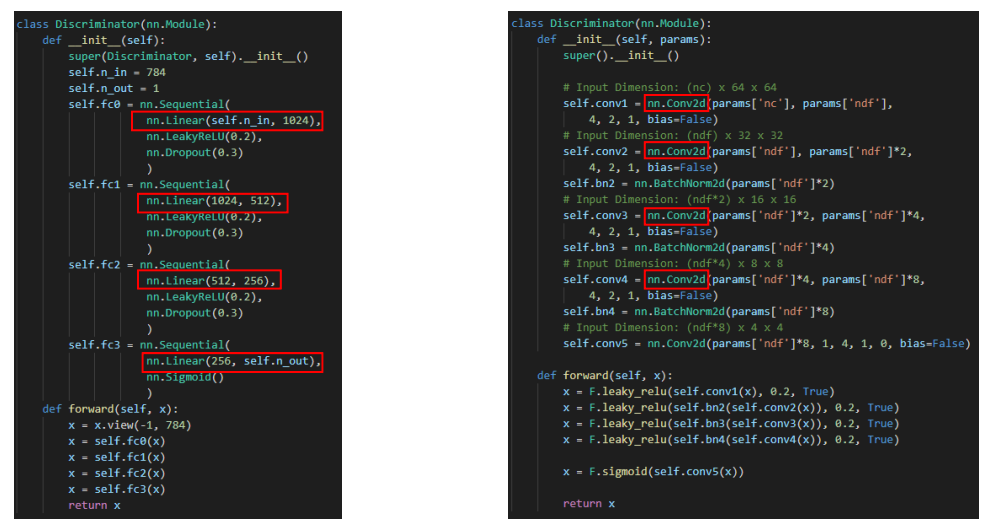 왼쪽의 경우 일반적인 Vanilla GAN의 Generator고 오른쪽의 경우는 DCGAN의 Generator입니다. 빨간 색 박스를 보시면 일반적인 FC Layer가 전부 Convolution Layer로 바뀐 것을 볼 수 있습니다. 그리고 위에서는 ConvTranspose2d로 Transpose Convolution을 적용한 것을 확인할 수 있습니다.