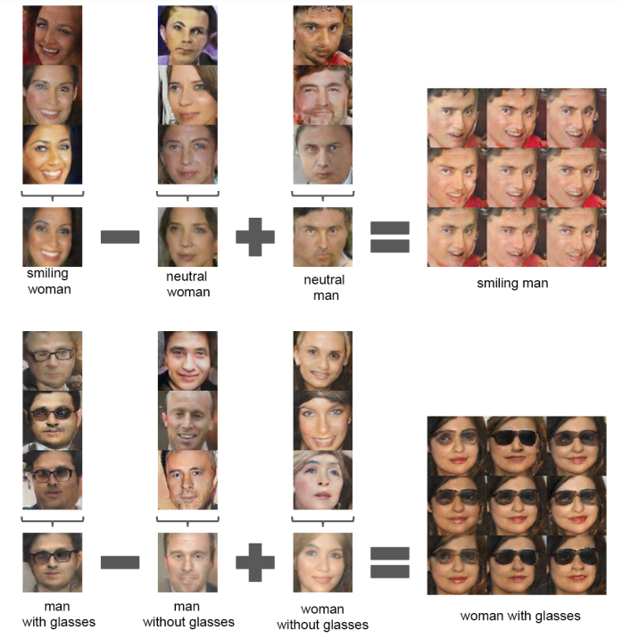 웃고 있는 여성의 사진에서 일반 무표정의 여성 사진을 빼고 일반 무표정의 남성 사진을 넣는다면? 바로 웃고 있는 남성의 사진이 나옴을 확인할 수 있습니다. 바로 이런 연산이 가능하다는 것을 본 논문은 실험을 통해 확인할 수 있었습니다. 하지만 이 웃고 있는 여성의 사진을 예로 들어, 저 특징을 잘 표현할 수 있는 대표성을 가져야 하기 때문에 저자는 적어도 3개의 샘플을 뽑아 평균을 매긴 벡터를 바탕으로 연산을 수행했다고 합니다.