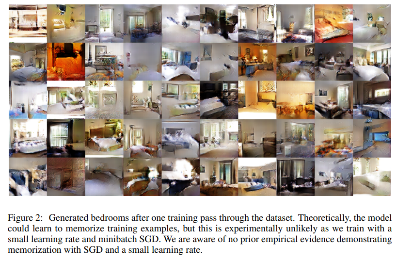 이렇게 보면 명확하게는 안보이지만 이전 GAN이 형성했을 때의 사진보다 훨씬 더 high-resolution 즉 고해상도의 이미지가 잘 생성되었다고 합니다. 즉, 이는 저자는 Convolution Layer를 사용하고 Leaky ReLU를 사용함으로써 얻어진 효과라고 언급합니다. 그리고 위의 샘플들은 이전 학습 데이터에 존재하지 않은 새로운 데이터를 생성함으로서 단순히 데이터를 암기하지 않음을 알 수 있었습니다. 물론 이 memorization 문제를 잘 대처하기 위해 추가적인 실험을 뒤에서 이어가는데 이는 뒤에서 자세하게 설명드리도록 하겠습니다.