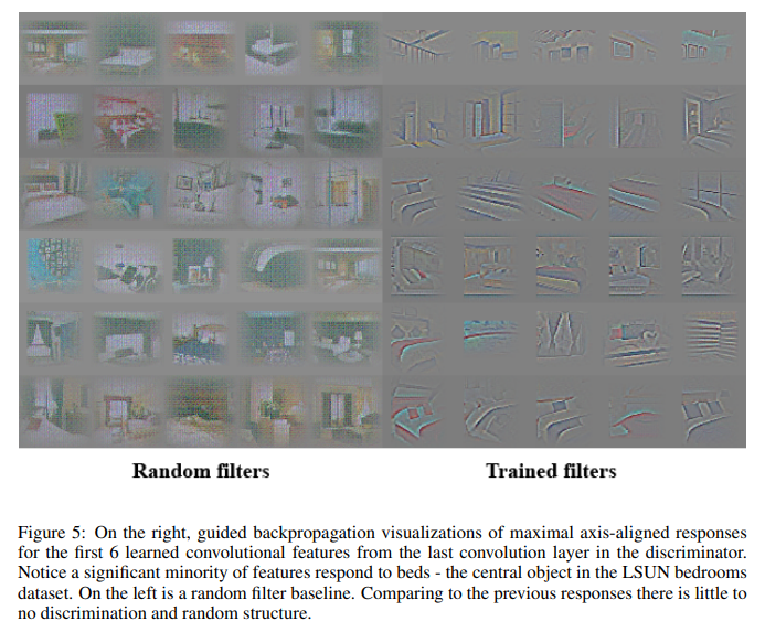 이 실험에서는 Discriminator가 이미지의 구체적인 feature를 잘 학습하는 것을 보다 더 직접 실험을 통해 보여주는 과정을 거쳤는데요. 한 마디로 이미지 안에 있는 구조, 즉 구체적으로는 hierarchy of features that are interesting을 더 집중해서 보고 싶었다고 합니다. 즉, 예를 들어 침실 이미지같은 경우는 당연하게 침대, 창문 같은 주요한 요소를 이루는 object들을 먼저 특징을 뽑을 수 있습니다. 우리가 일반적으로 아이에게 침실을 그려보라고 할 때 가장 먼저 그리는 요소도 그러하기 때문입니다. 이러한 것을 네트워크도 잘 캐치를 하는 지를 확인해보고 싶은 것입니다. 따라서 저자는 DCGAN에서 학습된 filter와 random하게 초기화한 filter 2개를 놓고 비교하는 과정을 거쳤습니다. 아래 그림은 각각이 가지고 있는 feature를 visualize를 해본 결과입니다.