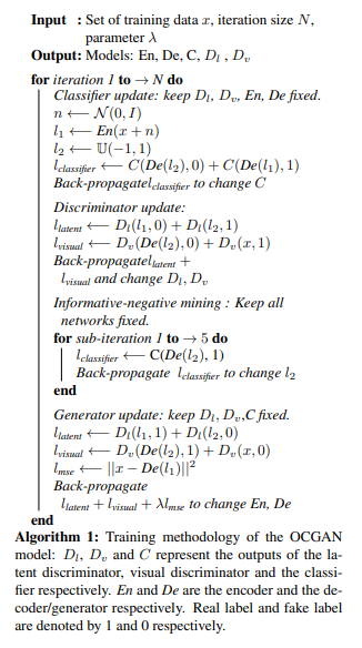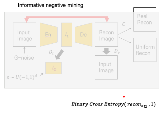 여기서 조금 더 주목해볼 부분은 바로, informative negative mining을 마치고 Generator를 update하는 부분입니다. 결국 본 아키텍처에서 generator로서 역할을 수행하는 것은 l1을 만드는 Encoder, reconstructed image를 만드는 Decoder입니다. 이 녀석들이 generator의 loss를 구성하게 되고, 이를 autoencoder를 업데이트하는 데에 필요한 MSE loss를 같이 합쳐 업데이트를 수행하게 됩니다. 저자는 더 질 좋은 output이 나와야하기 때문에 reconstruction loss에 감마 값 (본 논문에선 10)을 붙여 더 업데이트를 잘 수행하게끔 디자인을 하였습니다.