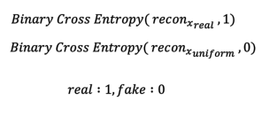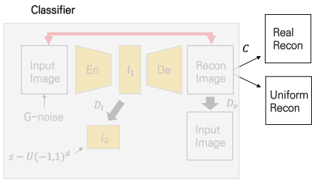 이 Classifier의 핵심 역할은 바로 이 재구성된 이미지가 얼마 만큼 given class와 닮았는 지를 판단하는 것입니다. 이 Classifier는 다른 네트워크들에 앞서 먼저 backpropagation이 이루어지는데, 그 때에 다른 네트워크들의 가중치는 전부 고정이 됩니다. real input 이미지와 uniform distribution에서 뽑은 두 샘플을 바탕으로 학습을 수행하게 되고, classifier는 바로 그 판단의 정확도를 늘려가게 됩니다. 이 때는 binary cross entropy 손실 함수를 사용하게 되고 real이 진짜 real이고 fake가 정말 fake인지를 나타내는 정도가 바로 그 손실 값의 의미가 됩니다. 그리고 이 손실 값을 기반으로 열심히 Classifier는 학습하게 됩니다.
