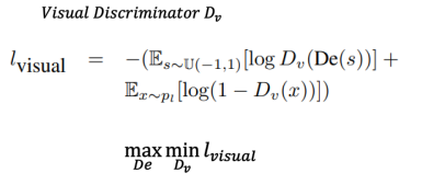 그렇게 l2에 근사가 되는 샘플들에서, 다시 decoder를 통해 generate하면, 그 이미지는 결국 real image가 갖는 분포와 유사해야 할 것입니다. 여기서도 앞에서 latent discriminator가 사용한 그 방법을 똑같이 사용하게 됩니다. 결국 이 l2의 분포를 real image의 분포에 근사시키는 방법이죠. visual discriminator의 loss function은 다음과 같이 디자인됩니다.