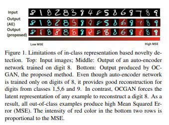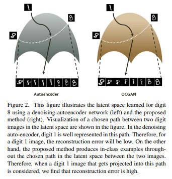 "8" 이미지를 normal이라고 가정해보겠습니다. 8에 대한 오토인코더는 잘 generate하겠지만, 상대적으로 8이 아닌 다른 글씨의 경운느 잘 생성을 못해야 합니다. 하지만 위 그림에 나와있듯, 1, 5, 6, 9 같은 경우도 오토인코더가 매우 잘 generate하는 것을 알 수 있습니다. 이상합니다. 한 번도 본 적이 없는 샘플들이고 8만 학습했는데 어떻게 나머지 클래스의 숫자들을 generate할 수 있었을까요? 바로 8과 같이 비교적 복잡한 object의 경우 latent space 내에서 in-class만이 아닌 out-of-class의 feature들의 특징도 가지고 있었기 때문입니다.