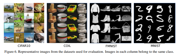 본 연구에서는 CIFAR-10, COIL, FMNIST 그리고 MNIST 데이터셋을 사용하였습니다.