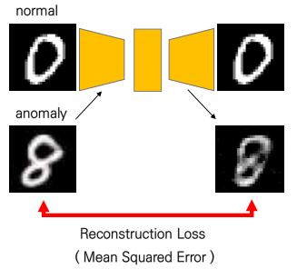 오토인코더 기반 구조에서, 위에처럼 0이 normal인 경우, 8인 경우를 anomaly로 가정해보겠습니다. 0인 경우는 우리가 오토인코더를 학습할 때 사용한 데이터이기 때문에 새로운 0이 들어오면 그 특징을 잘 뽑아내어 구성을 잘 할 것입니다. 하지만, 만약 normal과는 특징이 다른 anomaly가 들어오게 되면, 그 특징이 다른 무언가가 들어오면, 구성을 잘 하지 못할 것입니다. 바로 이 차이, 이 재구성을 했을 때의 차이 값인 reconstruction error를 바탕으로 anomaly를 detect하게 됩니다.