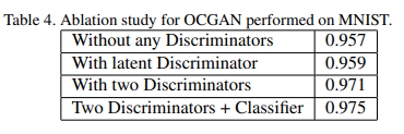 마지막으로 ablation study를 수행하는 데요. 아래와 같이 discriminator를 넣었을 때와 넣지 않았을 때, 한 개씩만 넣었을 때, 그리고 classifer를 넣었을 때를 각각 비교하게 됩니다. 결론은 모두 다 사용한 것이 더 좋은 결과이지만 결과가 큰 차이를 보이지 않아, 다른 데이터셋에도 실험해보면 더 정확히 알 수 있지 않았을까하는 생각이 들었습니다.