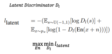 즉, distribution을 uniform으로 만들었다는 이야기인데, 이 방법을 수행하는 것으로 GAN의 로직을 사용합니다. GAN의 경우 gaussian noise를 점점 real input의 distribution으로 근사시키는 방법을 수행합니다. 그러한 과정에서 discriminator는 fake와 real를 구분하고 generator는 점차 근사한 distribution을 찾아서 그 샘플들을 만들게 됩니다. 이러한 방법을 이 케이스에 적용하면 real image의 latent space가 갖는 분포를 U(-1,1)인 l2에 근사를 시키는 것으로 생각했습니다. 그래서 다음과 같이 latent discriminator의 loss가 디자인되고, 이는 GAN의 구조와 매우 비슷한 것을 알 수 있습니다.