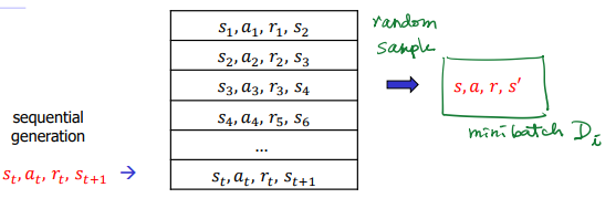 즉 저렇게 각 경험들이 들어갈 때, 저 구조는 queue 구조에 하나씩 쌓게 됩니다. queue는 구조적으로 FIFO 구조를 따르게 되므로 n개의 데이터를 가지고 있을 때 만약 새로운 경험이 들어오면 그 중 가장 오래된 경험 한 개를 out하게 됩니다. 그래서 최대한 최신 경험 데이터를 가지고 있는 것이지요. 그리고 학습을 수행할 때는 이 replay buffer에서 임의로 데이터를 뽑아서 사용하게 됩니다. 또한 여기서 랜덤하게 뽑기 때문에 연속되어 발생한 경험을 사용하는 것이 아니라 각 데이터 사이의 상관성이 적은 데이터로 학습을 하기 때문에 더 효율적으로 학습을 할 수 있다고 말합니다. 그래서 이러한 부분 때문에 experience replay는 off-policy 상황에만 사용할 수 있게 됩니다. 이러한 장점들을 가지고 성능을 증가시킨 방법이 바로 DQN입니다. 처음으로 딥러닝을 강화학습에 적용한 사례라고 할 수 있습니다.