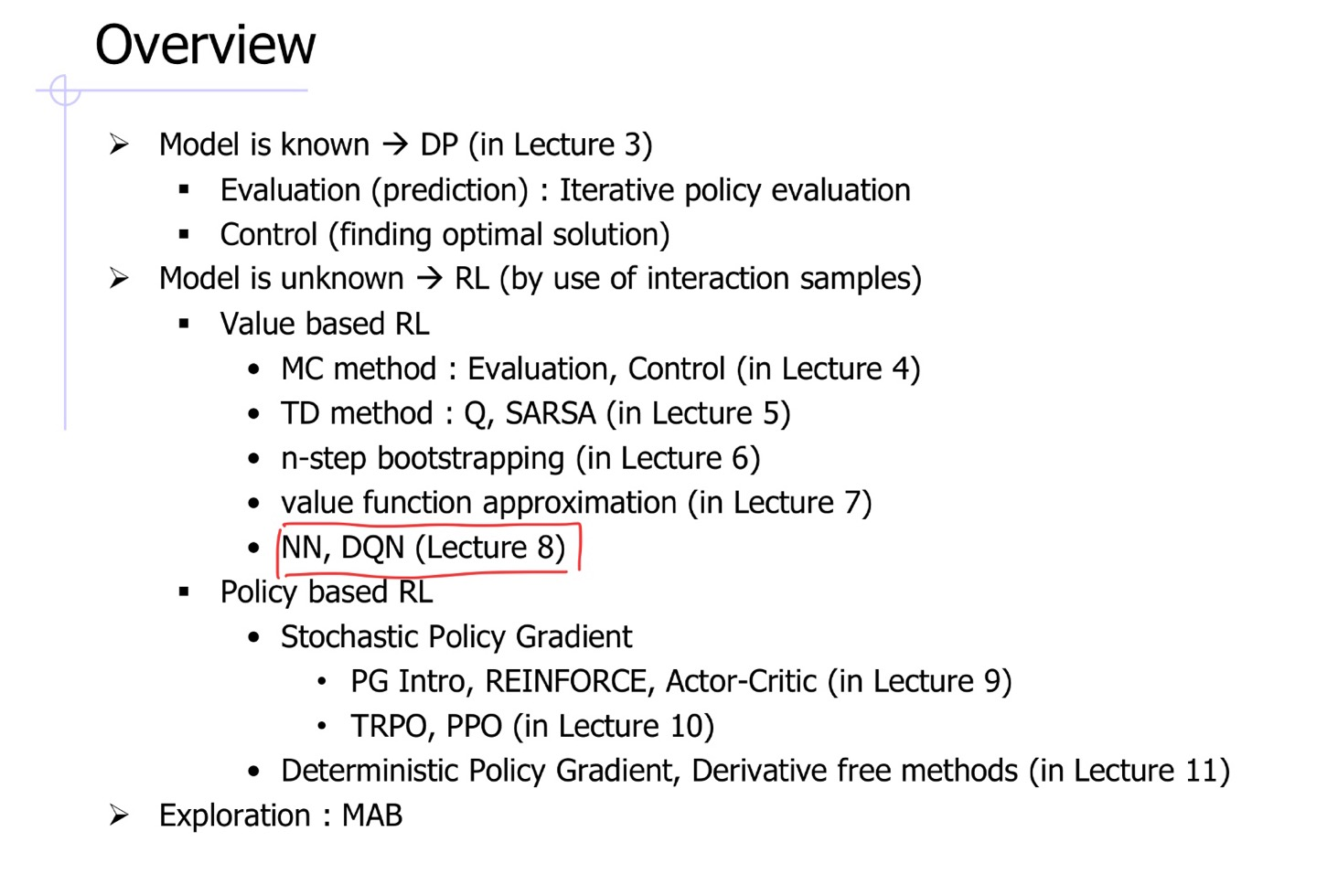 신하용 교수님께서 만드신 슬라이드 중에서 굉장히 RL 모델들의 분류가 잘 되어있다고 생각이 드는 슬라이드를 가지고 와 보았습니다. 이 중에서 본 포스팅에서 다루는 파트가 어딘 지도 살펴보겠습니다.