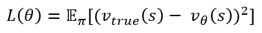 자 그렇다면, 우리는 실제 value 값은 다 저장해놓지 않고 딥러닝을 통해 근사하는 방법을 사용하는데, 예를 들어 v_θ (s)가 있다고 하면 우리는 이 value를 바탕으로 모형을 학습하게 되는데, 어떻게 딥러닝이 v_θ (s)를 잘 근사시켰다고 판단할 수 있을까요? 정답이 따로 알 수 있는게 아닌데도 말입니다. 즉, 아래 수식처럼 원래는 이런 loss function이 정의되서 backpropagation을 수행해야 하는데 저기서 v_true를 알 수 없으니 말입니다.