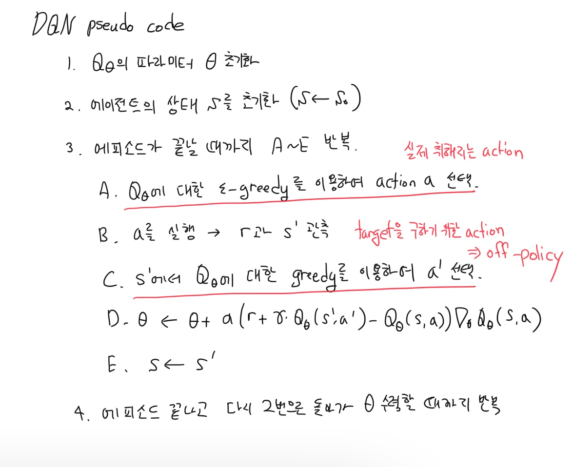 즉 에피소드를 수행하면서 action a를 Q를 바탕으로 선택을 하는 부분과 Target으로 사용하는 정답 값 r + γQ_θ(s`,a`)을 구하기 위한 과정에서 선택되는 action a`가 있음을 알 수 있습니다. 이 경우 e-greedy로 선택이 되는 샘플은 실제 에이전트가 action을 수행한 부분을 의미합니다. 반면, target을 구하기 위해 사용되는 a`는 실제 action을 취하는 것이 아니라 오로지 업데이트를 위한 계산에만 사용되는 부분입니다. 여기서 Q러닝이 off-policy라는 특징을 다시 한 번 확인할 수 있게 됩니다.