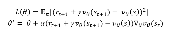 저기서 v(s_t+1) 항목이 들어갔는데 이를 정답처리로 할 수 있는지 의문을 품는 분들도 계실겁니다. 정답지는 상수이고 그것을 향해 점차 근사를 하는 것이 학습을 안정적으로 수행할 수 있게 해주기 때문이죠. 하지만 업데이트 시점의 θ을 이용해 TD target을 계산하면 이 값은 그냥 하나의 숫자입니다. 즉, 상수처럼 처리를 하게 되고 θ에 편미분을 하게 될 때 0으로 취급하게 됩니다. 그래서 pytorch로 구현시 이 타겟에 대해서는 .detach()를 해주어 미분을 수행하지 않게 됩니다. 코드에 대해서는 후반부에 다루도록 하겠습니다.