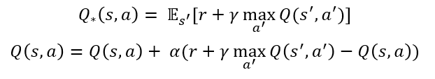 가치 기반 RL은 따로 명시적인 정책이 없습니다. 대신 state와 action에 대한 value를 담고 있는 q function을 활용해서 각 상태에서 가장 가치가 높은 액션을 선택하는 식으로 정책을 만들게 됩니다. 바로 이 방법을 기반하고 있는 것이 Q-learning입니다. Q-learning은 벨만 최적 방정식을 이용해 최적 action-value를 학습하는 내용을 바탕으로 합니다. 아래 수식은 벨만 최적방정식과 이를 이용한 Q 러닝 업데이트 수식입니다. ( Q-learning에 대해서는 MC, TD method와 함께 추후에 따로 정리하도록 하겠습니다. )
