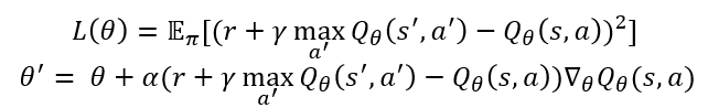 위 업데이트 수식은 정답과 추측치인 Q(s,a) 사이 차이를 줄이는 방향으로 업데이트를 수행합니다. 마찬가지의 방법으로 neural net에서 마찬가지로 손실함수를 정의할 수 있게 됩니다. 즉, 손실 함수는 아래와 같이 정의할 수 있고 gradient descent도 아래와 같이 계산이 됩니다.