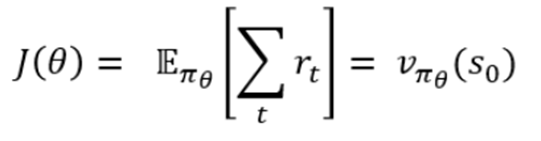 J는 당연히 최대화하면 좋은 거니까 보상의 합으로 이루어져 있습니다. 다만 에피소드들마다 다른 state를 방문하게 되면 그 값이 상이하기 때문에 합에다 expectation을 취해준 값을 J로 정하게 됩니다. 그러면 이는 밑의 수식처럼 보상들의 합의 기대값으로 표현이 가능하고 이는 return의 기댓값과 동일하기 때문에 초기 state에서의 value function 값과 동일한 모양 형태가 됩니다.