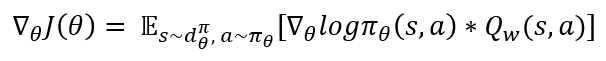 정책 네트워크 π_θ와 벨류 네트워크 Q_w가 함께 학습되는 것을 확인할 수 있습니다. 여기서 주목할만한 부분은 θ를 업데이트할 때에 실제 보상 값이 사용되지 않고 Q_w에 의존해서 사용된다는 점이 특징입니다.