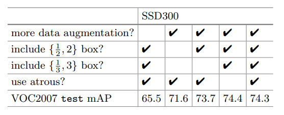 위 그림에서 알 수 있듯, data augmentation만 제거해도 성능이 확 감소함을 알 수 있습니다. 이는 one-stage detection 알고리즘이 갖는 본질적인 문제인 작은 object에 대한 detecting이 어려운 부분이 존재하기 때문입니다. SSD는 이러한 문제를 극복하기 위해 조금 복잡한 data augmentation 방법을 사용하는 것이 특징입니다. ( 특정 IOU 기준으로 filter해서 sampling해가지고 다시 ratio 맞추고 좀 복잡합니다.. ) 아무튼 이러한 복잡한 방법에 의존하는 것은 조금 아쉬운 부분이라고 할 수 있습니다.