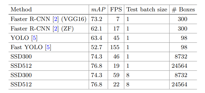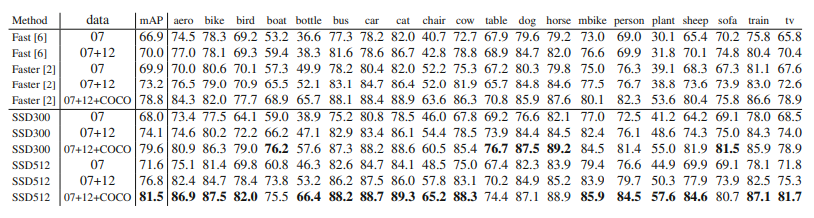 위 도표는 PascalVOC 2007, 아래는 PascalVOC2012에 대한 성능 결과입니다. 결과는 뭐 단연 SSD가 가장 우세한 것을 확인할 수 있었습니다. 속도도 확인해보겠습니다.