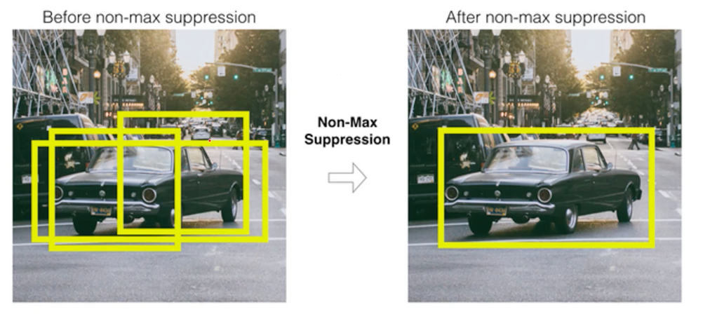 예를 들어 저렇게 자동차를 detect하는 bbox의 후보군이 왼쪽처럼 나왔다면 이를 잘 대표하는 것은 당연히 오른쪽의 bbox일 것입니다. 문제는 이 bbox를 어떻게 추릴 것인가하는 문제입니다. 바로 다음과 같은 step을 밟게 됩니다.