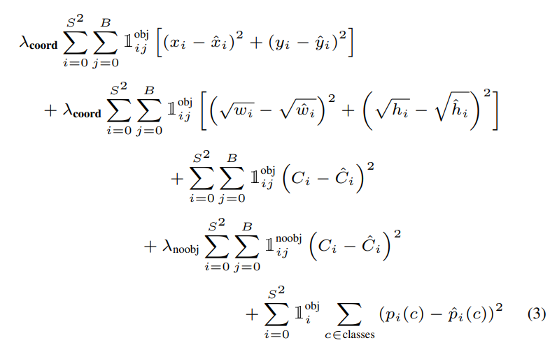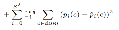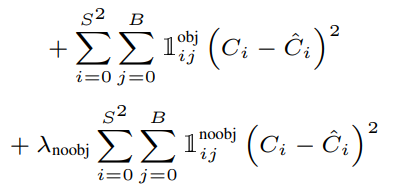 저 수식에서는 예측된 Object confidence score와 GT의 IOU의 예측 오차를 기반으로 구성됨을 알 수 있는데요. 신기한 점은, 위 수식에서 2번째 term이 추가되어있다는 점입니다. 즉, Object를 책임지는 Bounding box의 confidence loss와 Object가 없어야 하는 Bounding box의 confidence loss가 같이 구성되어 있다는 점이 특징입니다. 왜 저 2번째 term을 추가했는지는 저도 의문이긴 하네요..