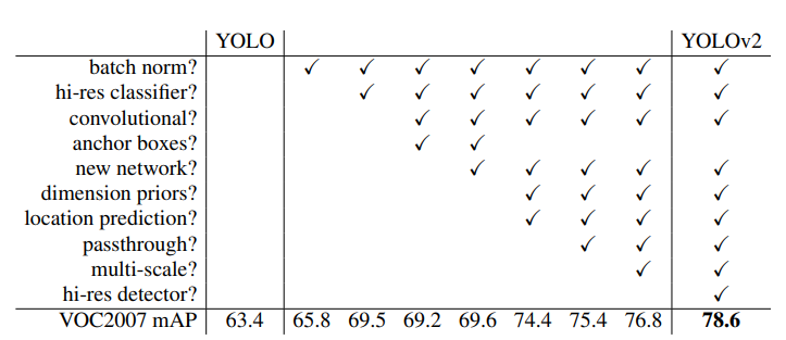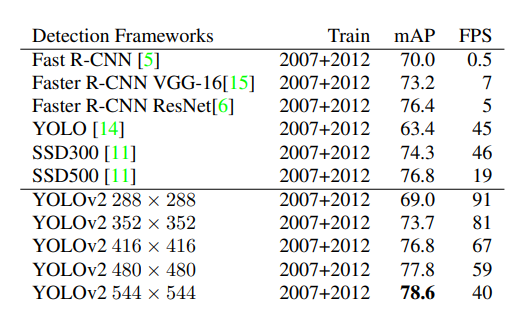 - YOLO-v2 (2016.12) : SSD와 대등한 성능 수행, Inference 속도 SSD보다 빠름