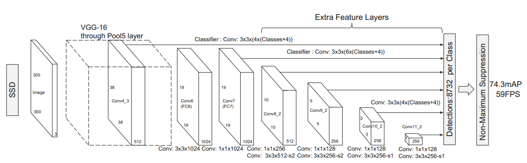 위 그림은 SSD 논문에서 가져온 그림인데 거시적인 구조만 그리면 다음과 같습니다. 그림을 보면 알 수 있듯, feature map이 convolution 연산을 수행하면서 각 stage 별로의 feature map 마다마다 classifier를 붙이는 것을 확인할 수 있습니다. 조금 특이한 구조인데 왜 이러한 아이디어를 사용하였는 지 확인해보겠습니다.