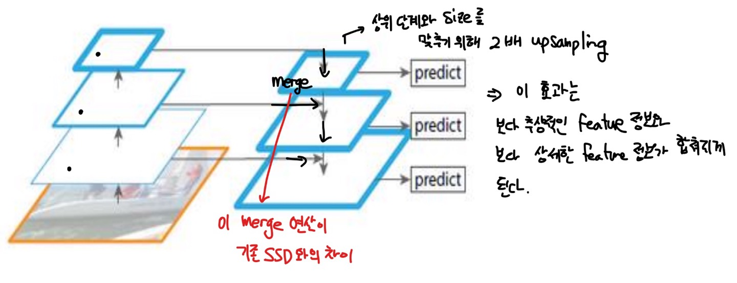 우선 일반적인 input이 들어오면 다음과 같은 convolution 을 통과하면서 feature map이 구축됩니다. 그 다음으로 예측 task를 통과할 때 저 feature 정보만이 아니라, 이전에 구축되었던 상위 단계의 feature map 들을 같이 merge해서 predict 연산을 수행합니다. 저 merge 단계가 없다면 기존 SSD에서 수행한 multi-level feature 연산과 다르지 않지만 저 merge 단계를 수행하는 부분을 통개 보다 추상적인 정보와 보다 상세한 정보를 같이 활용하는 장점을 가지게 됩니다. merge를 하기 위해서는 size가 맞아야 하는 부분이 필요하기 때문에 더 낮은 단계에서 상위 단계와 size를 맞추기 위해 2배로 upsampling하는 단계를 수행해줍니다.