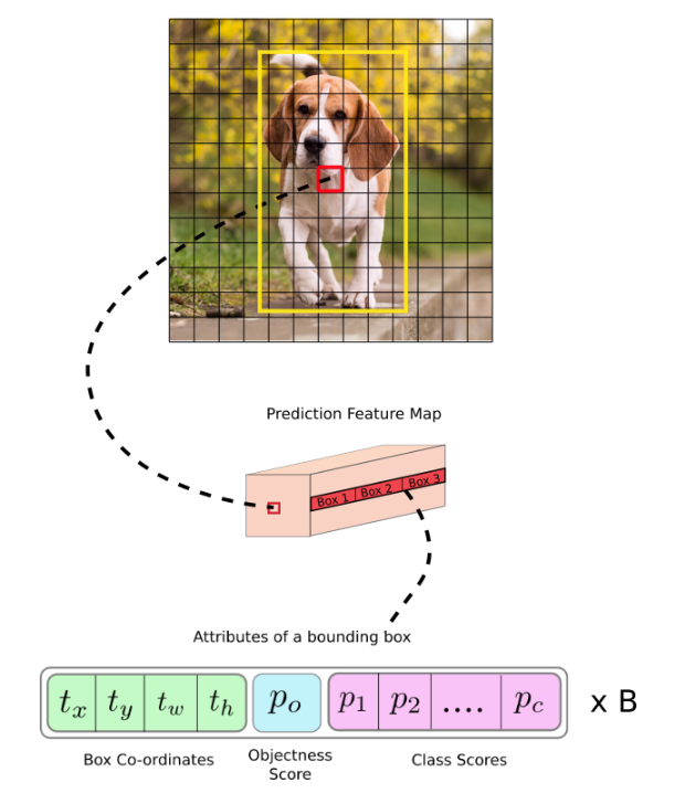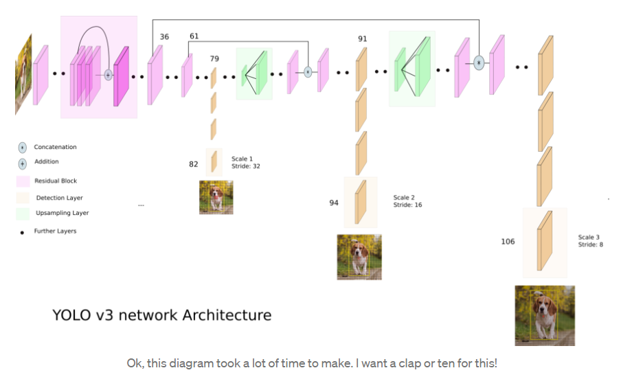 위 수식에서 DarkNet-53 backbone을 사용하는 구조입니다. 맨 왼쪽 상단의 '+' 부분이 바로 Skip connection을 수행해주는 부분입니다. ( Skip connection은 Residual learning의 개념으로 본 개념에 대해 낯선 분들은 아래 블로그 링크 'ResNet'을 참고해주시면 좋을 것 같습니다 ). 저기서 왼쪽 상단에 처음 36번째 layer와 61번째 layer 그리고 79번째 layer에서 도출되는 feature map 정보를 바탕으로, 먼저 79번째 layer에서 쭉쭉 진행해 82번째 layer에서 도출된 강아지 feature (13x13) map이 도출된 것을 확인할 수 있습니다. 그리고 더 convolution 연산을 진행하다 이를 2배 up sampling을 해준 다음에 61번째 layer에서 뽑은 것과 merge를 수행해줍니다. 다음으로 94번째 layer를 통해 도출된 강아지 feature map (26x26)이 도출됨을 확인할 수 있습니다. 그리고 마찬가지로 2배 upscaling을 해주어 상위 레벨인 36번째 layer를 통과한 size의 데이터와 merge를 시키고 연산 끝에 마지막 106번째 layer를 통과한 강아지 feature map (52x52)가 구축되게 됩니다. 즉, 이렇게 3개의 output feature map ( 13x13, 26x26, 52x52 ) 이 도출됩니다.