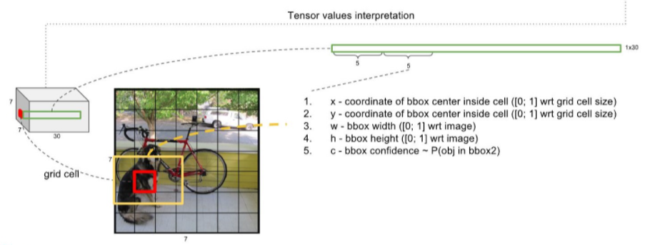 7x7x30의 정보를 활용한다는 것이 어떤 의미일까요? 위 그림을 자세히 보시면, 예를 들어 저렇게 7x7x30의 feature map에서 cell 하나를 뽑게 되면, 그 cell 하나는 30의 depth를 가지게 됩니다. 그러면 그 30의 depth에는 어떠한 정보를 포함하고 있는 걸까요?