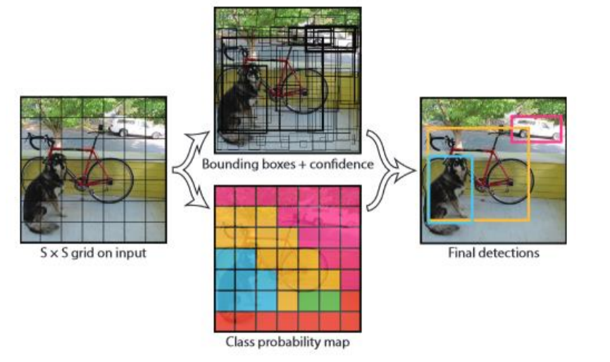 예를 들어 위의 이미지는 7x7 grid로 나누게 되고 각 grid의 cell이 하나의 obejct에 대한 detection을 수행하게 됩니다. 구체적으로는 각 grid cell이 2개의 bounding box의 후보를 도출하게 되고 그 bbox들을 실제 ground truth에 근사시키면서 학습을 수행하게 됩니다.