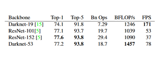 그리고 기존 googlenet이 아닌 DarkNet-19라고 하는 독자적인 backbone 모델을 디자인하였는데, 끝단은 dense layer가 아니라 convolution layer를 사용함으로써 동적 이미지 크기 할당을 가능하게 하였고, 기존 VGG16이나 YOLO-v1에서 사용한 수정된 inception 이 갖는 연산량보다 훨씬 적은 연산량으로 더 높은 성능을 내는 backbone 모형을 구축했다고 합니다.