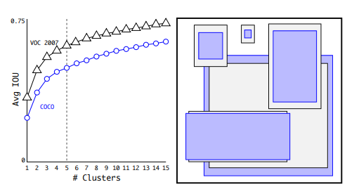 다음으로 기존에는 anchor box를 사용하지 않았었는데 version 2부터는 anchor box의 개념을 사용하기 시작합니다. 여기서는 cell 마다 5개의 anchor box가 존재하게 됩니다. 그리고 이 anchor box를 만드는 데에는 k-means clustering이 적용되었다고 합니다.