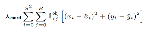 우선 해당 식은 일반적인 중심 좌표의 regression 수식입니다. S^2는 grid cell의 수가 되고 B는 2개의 bbox 후보가 됩니다. 이 때 독특한 점이 지시 함수가 들어가 있음을 알 수 있는데요. 예를 들어 현재 바라보고 있는 Bbox가 'object를 책임지고 있는 bbox이면 1, 아니면 0'을 label하는 것입니다. 즉 모든 bbox를 전부 저 regression을 적용하는 것은 아님을 알 수 있습니다.