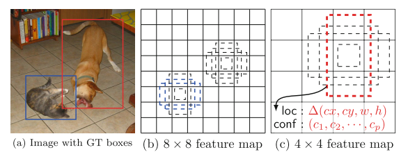 구체적으로 저런 고양이 강아지 사진이 있을 때, 8x8에서는 2번째 그림과 같이 anchor box들이 구축되는데, 고양이 부분에서 파랗게 표시된 부분이 바로 GT와 매칭된 anchor box를 의미하게 됩니다. 매칭 기준은 IOU 50% 이상을 기준으로 판별합니다. 반면 8x8에서는 강아지가 detect되지 않지만 4x4에서는 detect되는 것을 확인할 수 있습니다. 이 매칭 박스 정보로 classification을 수행하며 이 매칭 박스는 GT와 가까워지기 위해 계속 offset 값을 계산하면서 Bbox regression을 수행하게 됩니다.