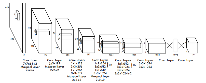 저렇게 backbone을 통과하고 나면, 2개의 dense layer를 거치게 되는데, 이들은 classification과 regression을 수행하기 위해 적용되는 layer로 볼 수 있습니다. 2개의 dense layer를 거쳐 구성된 "7x7x30" 의 feature map을 구축하게 되고 이들의 information을 활용해서 Bbox regression과 object detection의 예측을 수행하고 이 결과를 바탕으로 네트워크를 업데이트하게 됩니다.