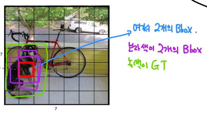 예를 들어 저 빨간색 cell에 해당하는 부분에 대한 bbox가 보라색처럼 표기가 되면, 이들이 2개의 bbox 후보가 될 수 있습니다. 이들을 녹색 GT를 바탕으로 근사시키면서 학습이 이루어지게 됩니다.