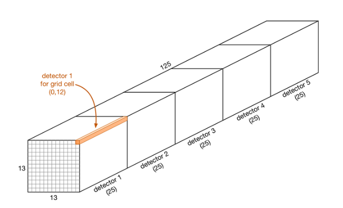 이렇게 구축이 된 YOLO-v2의 네트워크를 통과하고 나면 구성되는 feature map의 크기는 13x13x125가 되는데, 여기에서는 어떠한 정보가 포함되는 지를 확인해보겠습니다.