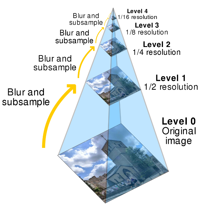 마땅한 사진 쓸게 없어서 제 5년 전 증명 사진을 가져왔네요. 예를 들어 위 빨간색 사진이 window라고 하면 전통적인 window slicing 기법에서 저렇게 scale에 따라 object가 잘 detect될 수도 있고 잘 안될 수도 있다는 것을 알고 있습니다. 큰 사진에서는 저 window size로는 얼굴을 제대로 인식하지 못해 누구인지 명확하게 알 수는 없지만, 이미지를 더 줄임으로서 맨 오른쪽의 size로는 명확하게 누구인지 파악할 수 있을 정도로 정보를 얻을 수 있습니다. 이 방법을 바로 이미지 피라미드라고 합니다.