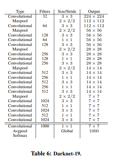우선, feature extractor의 모형이 Inception이 아닌 Darknet-19로 바뀌게 되었습니다. Darknet의 경우는 YOLO의 저자 Redmon이 자체적으로 만든 CNN 네트워크라고 볼 수 있습니다.