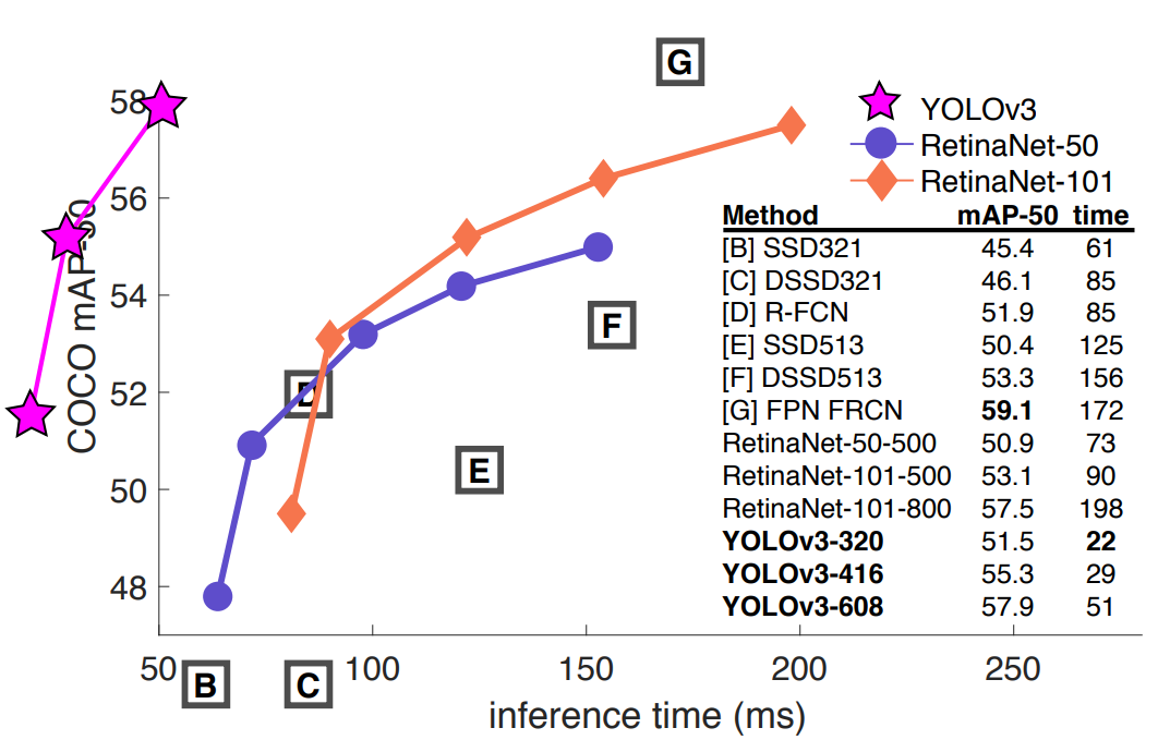마지막으로 재밌는 그래프를 도입하는데요. YOLO-v3는 앞선 모형들 대비 앞도적인 수행 속도를 가지고 있으면서 detection 성능이 그렇게 나쁘지 않는 준수한 성능을 보임을 확인할 수 있습니다. 바로 이러한 부분이 version 3가 갖는 특징입니다.