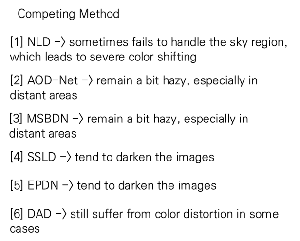 NLD, AOD-Net, MSBDN, SSLD, EPDN, DAD 와 같은 dehaze를 푸는 다양한 알고리즘들을 비교실험으로 넣었는데요, 어떤 경우는 dark한 경우도 있었고, 이미지에 왜곡이 되는 경우가 종종 있었지만 PSD는 이들 대비 상대적으로 퀄리티가 좋은 이미지를 도출했다고 합니다.